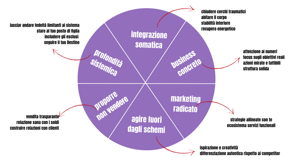 Il metodo Fare Impresa Viva si basa su dei pilastri che ti aiutano a riportare il tuo sguardo verso la vita: costellazioni familiari e aziendali specificamente formulate per aiutare imprenditrici solo, come te, come me. Unite ad un approccio al marketing che tiene conto dei tuoi valori- questo è il cuore del tuo progetto e non va snaturato con urgenze, pressioni e marketing ai limiti dell’eticità.